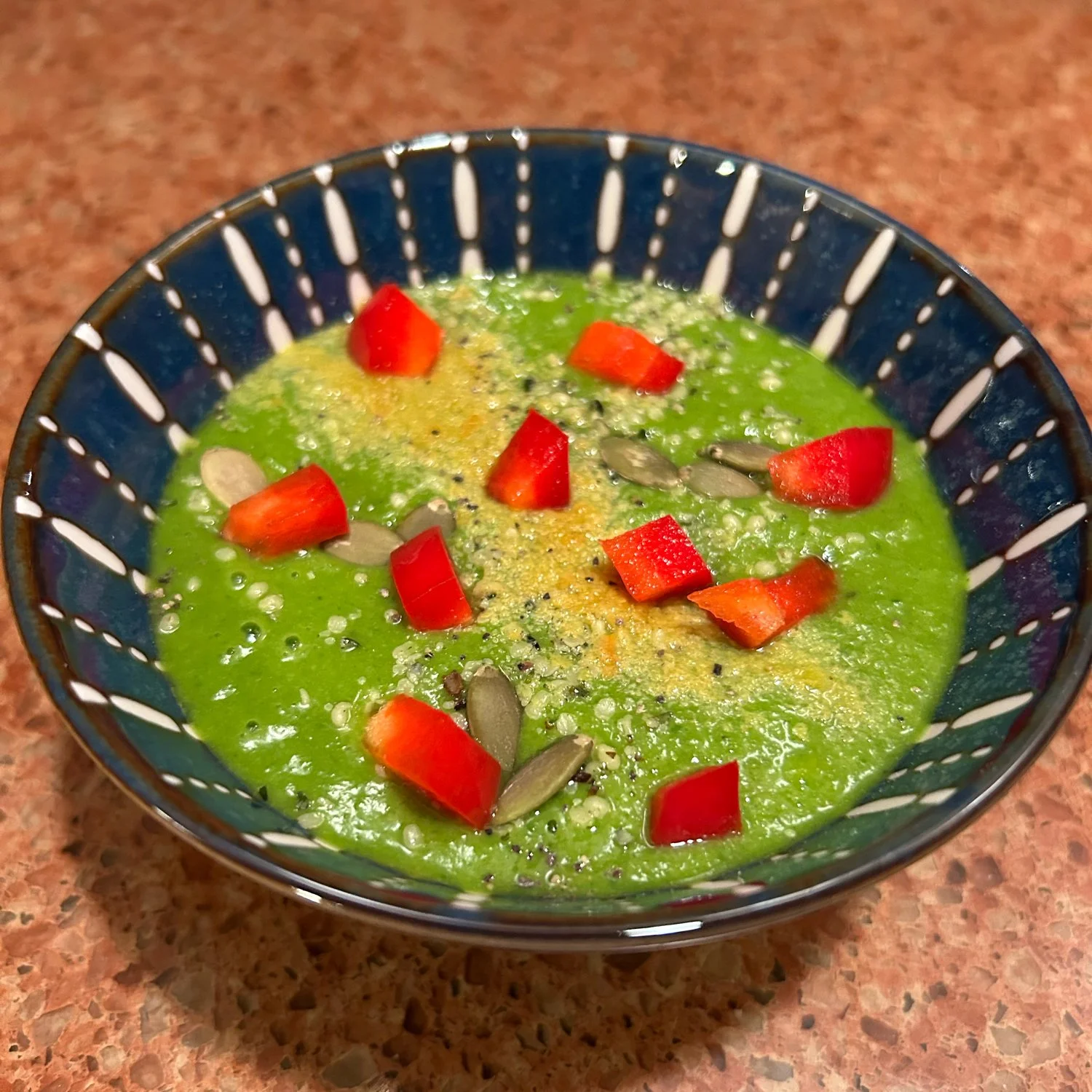 Add more water if you’d like a thinner soup. Garnish with hemp seed, fine chopped red and cucumber and enjoy!